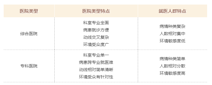 不同的醫(yī)院類型在就醫(yī)人群和醫(yī)院整體設(shè)計(jì)上有著不同的特征,但是由于運(yùn)維管理、室內(nèi)設(shè)計(jì)等多方面的原因,很多患者出現(xiàn)在綜合醫(yī)院看病流程繁瑣、醫(yī)院環(huán)境惡劣的就醫(yī)體驗(yàn),而專科醫(yī)院雖然相對(duì)就醫(yī)環(huán)境較好,但高價(jià)格也給老百姓造成了心理壓力。