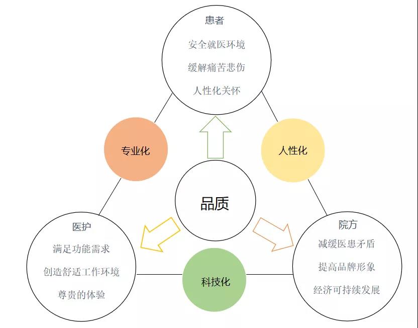 醫(yī)院的最終目的是為病人、家屬以及醫(yī)務(wù)人員提供更好的服務(wù)品質(zhì),好的醫(yī)院室內(nèi)設(shè)計(jì)必須具備“四化”,即專業(yè)化、人性化、科技化和尊貴化,主要通過公共空間和科室空間兩個(gè)大的方面來設(shè)計(jì)體現(xiàn)。