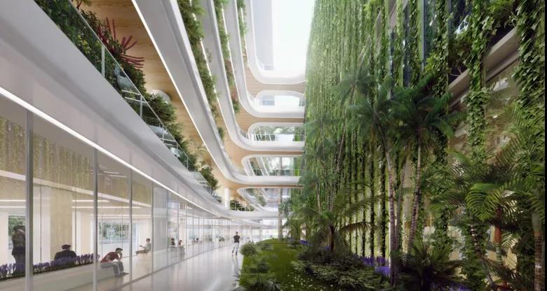 花園式醫(yī)院追求綠意盎然自然治愈,讓空間充滿生機(jī)和活力。主要通過內(nèi)裝設(shè)計(jì)來打造,可以采用局部綠植墻點(diǎn)綴空間,合理利用采光中庭及庭院,實(shí)現(xiàn)室內(nèi)室外借景,也可以局部植入綠植景觀小品,增強(qiáng)細(xì)節(jié)感。