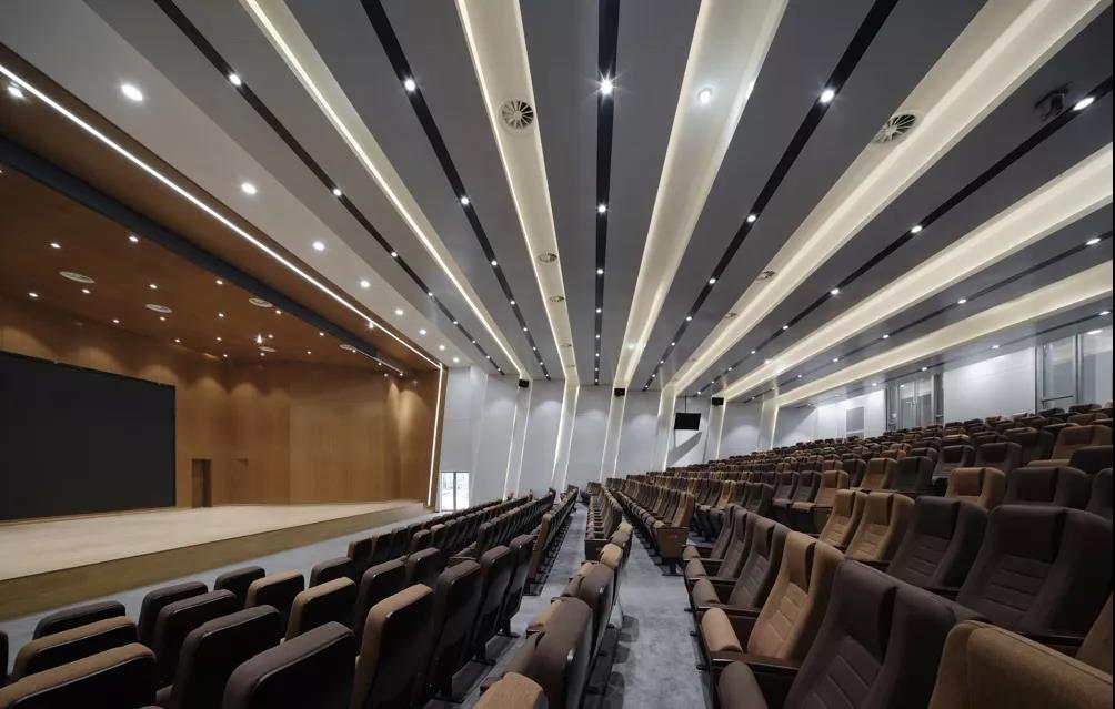 ▲ 圖51 專業(yè)化/尊貴化:綜合樓報(bào)告廳采用線性燈光氛圍、主舞臺(tái)采用木色色調(diào)