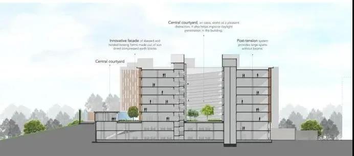 這有助于使部門保持獨立,從而在功能上保持每個樓層的無菌性。經過精心的戰略規劃,該建筑試圖做出宏偉而又本地化的趨勢,并注意磚砌藝術品和裸露的混凝土等細節。該項目是被動設計和可持續性的典范。天然壓縮的,風干的土磚(CSEB)是在現場生產的,用于創建具有箱形和深色陰影投影的雙層外墻,以減少熱量獲取。CSEB通過其自身的孔隙率及其在空腔墻和jaalis等元素中的使用,使建筑物能夠呼吸,從而使該結構適應該地區的氣候。這減少了內部熱量獲取,從而實現了最大的熱舒適性,從而降低了能耗。這些磚塊是使用砌塊機在現場生產的,從而為當地人提供了更多的就業機會,并確保了最低的碳排放量。這是CSEB在如此大規模的項目中的首次使用。