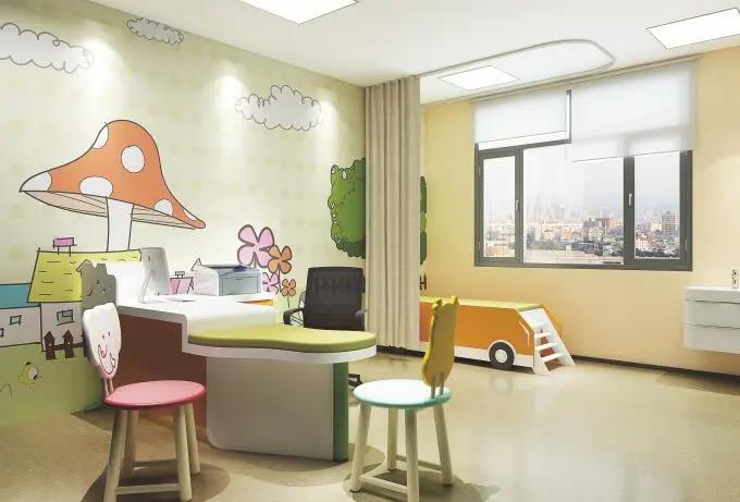 兒科可不設置二次候診區,但建議在公共候診區設置符合院感和安全要求的小型休閑游樂場;裝修涂料建材要求綠色環保,樣式以“卡通”人物或場景為主;診床和家具必須做圓弧處理或加防撞安全保護,診床可選用玩具型家具床;可選擇不設置隔簾,減少兒童密閉恐懼感。