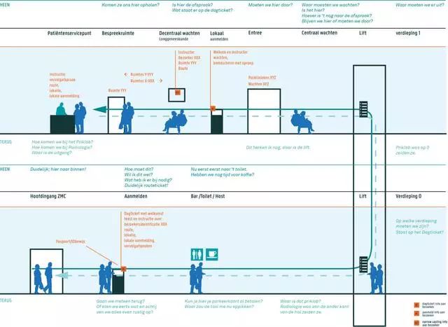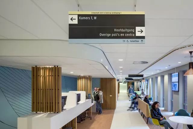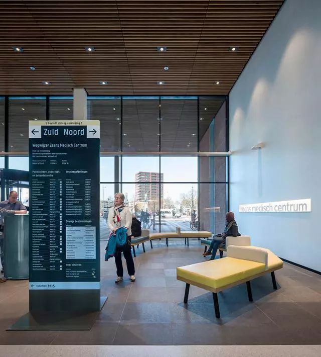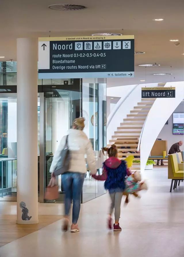 為了解決這個問題,Zaans Medisch Centrum設(shè)計團隊從醫(yī)院入口到內(nèi)部,全程做好導(dǎo)視標(biāo)牌的點位布置。